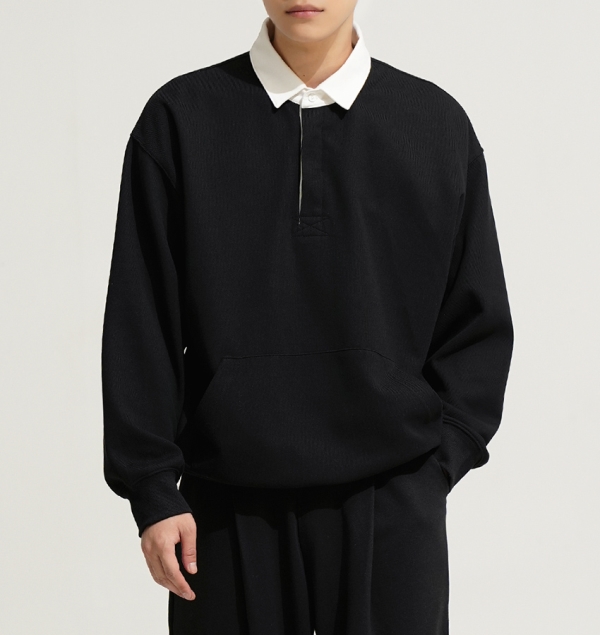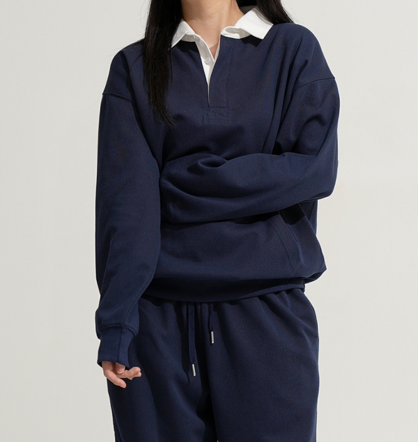 90년대 감성을 재해석하여 트렌디하고 베이직한 럭비 맨투맨 상품임 활동성 및 일상 생활/일상복으로도 레이어드 가능하며 같은원단의 스트링 바지와 셋업 구성 가능함