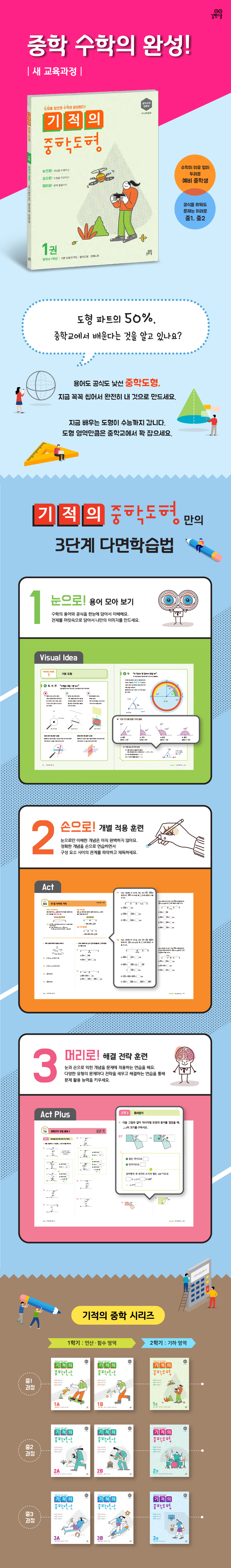 『기적의 중학도형』은 모든 중학생이 도형을 쉽게 익힐 수 있도록 구성한 중학수학 입문서이다. 눈으로 보고, 손으로 익히고, 머리로 적용하는 3단계 다면학습을 통해 직관적으로 이해한 개념을 수학적 언어로 표현하면서 중학교 수학의 기본기를 다질 수 있다. 초중고 기하 영역의 핵심인 중학교 도형은 지금 잡아야 고등학교까지 헤매지 않는다. 도형이 이유 없이 두렵다면, 공식을 외워도 문제 풀기는 어렵다면 『기적의 중학도형』이 도움이 될 것이다.