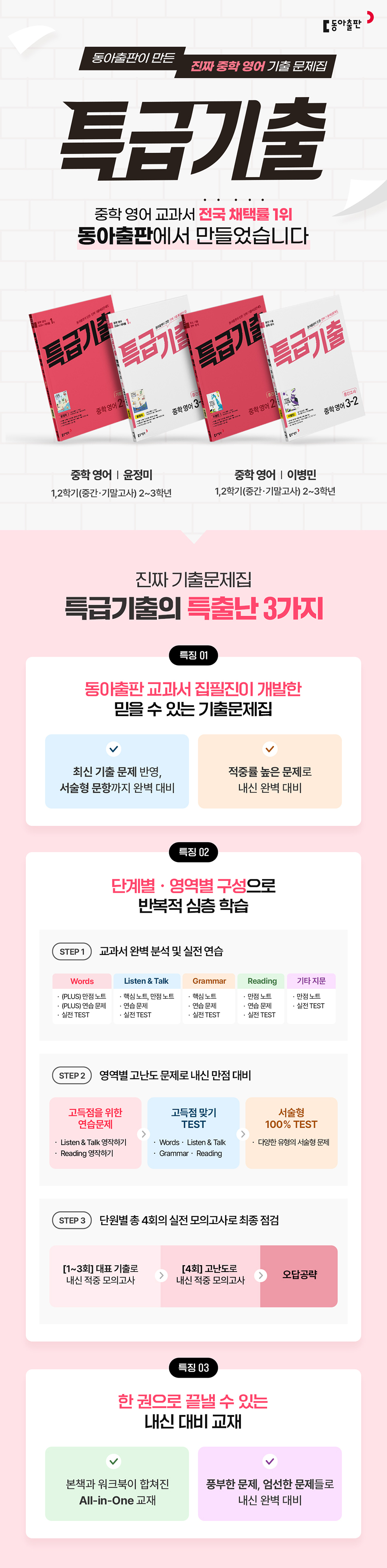 이 책은 동아출판㈜ 「Middle School English 2 (윤)」 교과서를 공부하는 학생 여러분이 단계별·영역별 반복형 심층 학습을 통해 교과서 내용을 완벽하게 이해하고, 적중률 높은 최신 유형 문제로 서술형 평가와 수행평가를 포함한 모든 종류의 학교시험에 철저히 대비할 수 있도록 구성하였다.