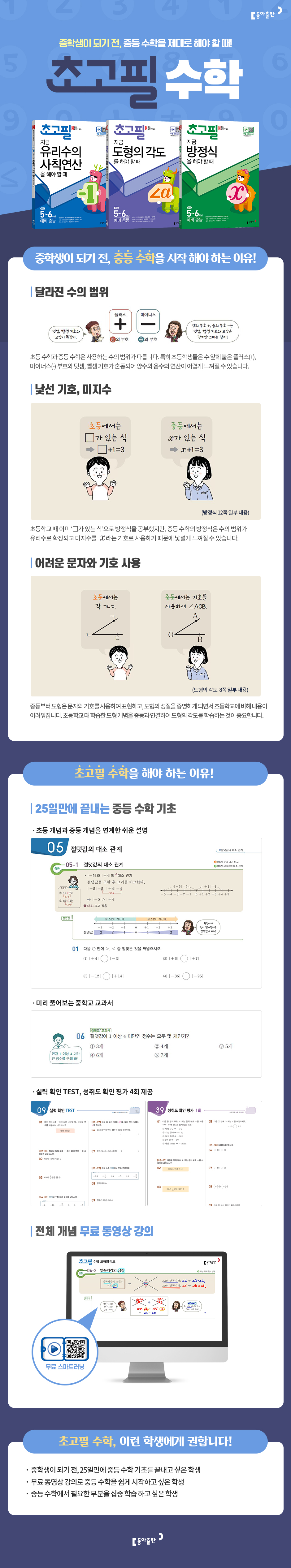 개념 무료 동영상 강의 제공초고필 수학 시리즈는 중학교 수학의 기본이 되는 『유리수의 사칙연산』, 『방정식』, 『도형의 각도』를 초등학생 눈높이에 맞게 구성한 중등 수학 기초 학습서이다. 초등 수학과 연결하여 중등 수학 개념을 쉽게 이해할 수 있고, 재미있는 개념 동영상 강의로 혼자서도 중등 수학을 미리 공부할 수 있다.
