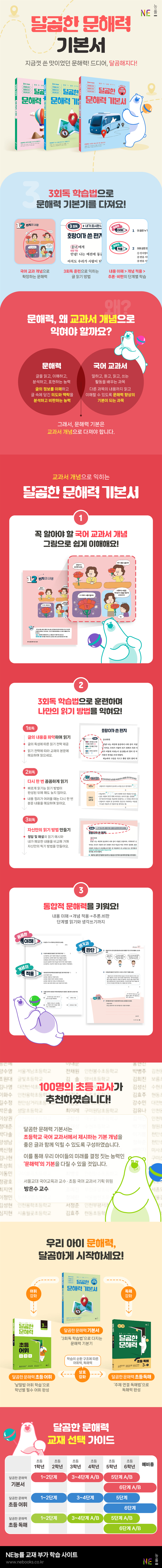 꼭 알아야 할 교과 개념을 바탕으로 지문에 따른 읽기 방법을 적용하여 꼼꼼하게 3회독을 하면 우리가 상상하는 것보다 더 근사하고 굉장한 힘인 ‘문해력’을 갖게 될 것입니다. 『달곰한 문해력 기본서』가 우리 아이들이 스스로 생각하고 판단하며 세상과 소통할 수 있도록 돕겠습니다.