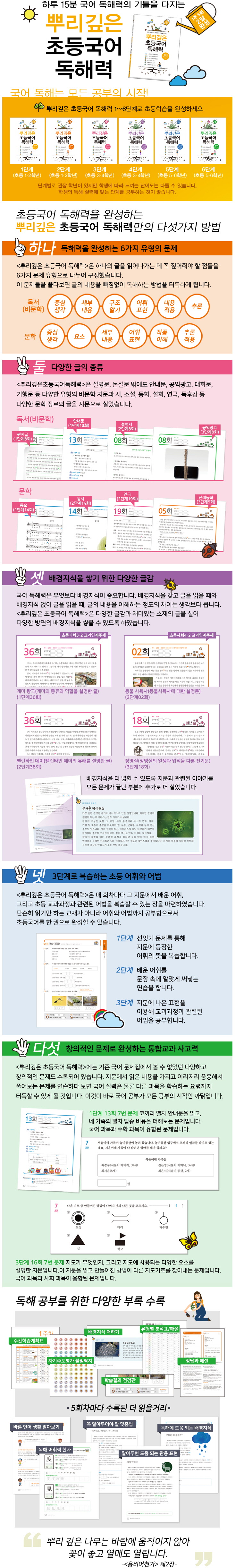 처음 초등국어 독해 공부를 시작하는 학생을 위한 재밌고 다양한 지문 수록하고 교과서 수록 작품 및 배경지식으로 알아둘 만한 전래동화, 우화 수록하였다. 매 지문마다 어법과 어휘만을 따로 공부하는 장 수록하고 학습결과를 재밌게 기록할 수 있는 학습평가 붙임딱지 수록하였다. 공부한 날이 쌓여갈수록 학생 독해력의 어떤 점이 부족한지 알게 해주는 ‘문제 유형별 분석표’ 수록하고 독해력을 기르는 데 도움이 되는 여러 가지 읽을거리 다수 수록하였다.