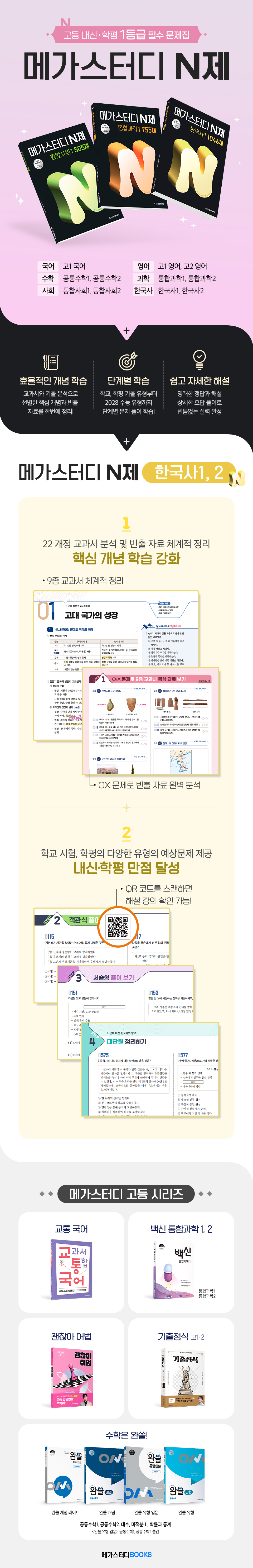 2022개정 교육과정과 9종 교과서를 철저히 분석, 반영하여 새 교육과정 개념 학습을 강화하였다. 교과서와 기출 분석으로 핵심 개념과 빈출 자료를 한 번에 정리하여 효율적인 학습을 완성할 수 있다. 학교 기출, 학력평가 기출 문제를 철저히 분석, 선별 수록한 기출 문제집이다. 새 교육과정의 출제 경향에 맞는 빈출 유형, 신유형, 고난도, 서술형 문제를 충분히 수록한 내신 1등급 대비 문제집이다.