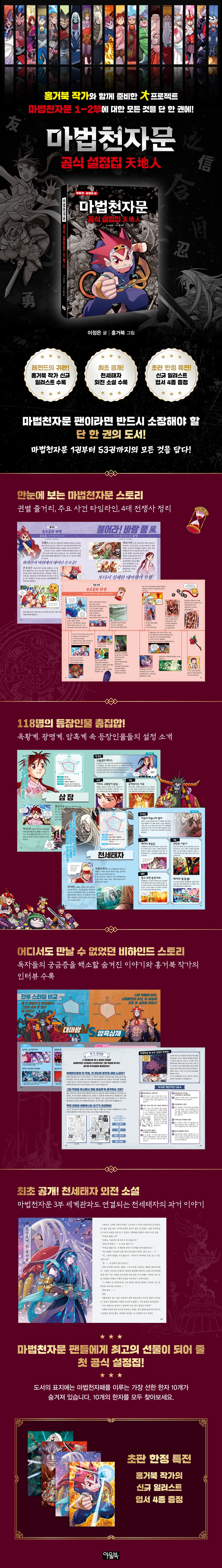 2003년 11월 〈마법천자문〉 1권을 시작으로 2,200만 독자들에게 많은 사랑을 받아 온 〈마법천자문〉 시리즈는 어린이 한자 학습만화를 넘어 재미있고 철학적인 세계관으로 모든 연령층의 독자를 사로잡은 하나의 콘텐츠가 되었다. 21년간 독자의 사랑과 관심에 보답하기 위해 홍거북 작가와 함께 손오공의 모험이 시작된 시점부터 암흑상제와의 마지막 전투까지를 다룬 1~53권의 모든 것을 담은 공식 설정집이 출간된다. 설정집에는 53권까지의 줄거리와 등장인물 소개, 연대표, 세계관 설정을 한눈에 보기 좋게 정리했다. 특히 홍거북 작가의 신규 일러스트와 천세태자 외전 소설, 등장인물 TMI와 제작 과정 아트워크 등 다양한 볼거리와 읽을거리를 설정집에서 최초로 공개한다. 〈마법천자문〉을 좋아하는 사람이라면 누구나 기다려온 〈마법천자문 공식 설정집: 天地人〉으로 옥황계, 광명계 편의 재미와 감동을 다시 한번 느껴 보자!