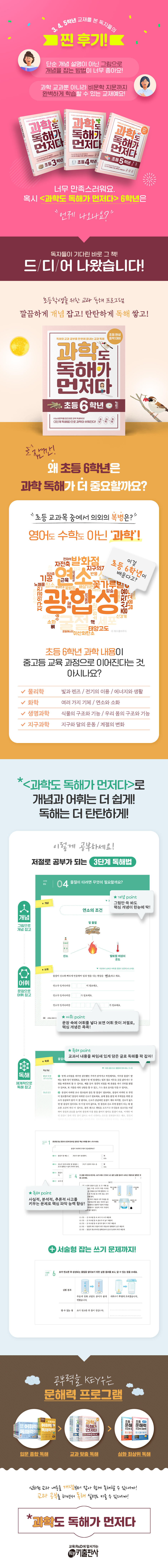 ‘과학’ 교과서는 학년이 높아질수록 다루는 내용이 깊고 다양해져요. 그래서 ‘과학’이 점점 더 어렵고 막막하게 느껴질 수 있어요. 새로운 과학 개념과 어휘가 많아서 교과서 내용을 한 번에 이해하기 어렵거든요. ‘과학’을 쉽고 재미있게 공부하기 위해서는 먼저 중요한 개념과 어휘를 익힌 다음 독해하는 연습이 필요해요. 국어 과목만 독해 연습을 해야 하는 게 아니에요. 낯선 개념과 읽어야 할 어휘가 많은 ‘과학’도 독해 연습이 꼭 필요해요. 〈과학도 독해가 먼저다〉의 단계적인 독해 연습으로 어렵던 ‘과학’이 쉽고 재미있어져요! 왜 과학은 개념과 어휘를 익혀야 할까요? ‘과학’은 수학처럼 기초가 중요한 과목이에요. 개념이 촘촘하게 연결되어 있고 학년이 올라갈수록 내용의 깊이와 폭이 확장되기 때문에 앞의 내용을 이해하지 못하면 뒤의 내용을 이해하기가 어려워요. 그래서 ‘과학’을 처음 배울 때부터 개념 하나하나를 제대로 이해하는 것이 중요해요. 그림과 함께 체계적으로 잘 정리된 개념을 익히면 과학을 쉽게 공부할 수 있어요. ‘과학’은 개념을 이해하는 것이 무엇보다 중요해요. 낯설고 어려운 교과 내용도 개념만 잡으면 척척 이해할 수 있어요. 〈과학도 독해가 먼저다〉의 체계적인 개념 학습으로 알쏭달쏭하던 '과학'의 개념이 명쾌하게 정리돼요! 개념 - 어휘 - 독해 3단계 완성 [개념] 그림으로 쉽게 1. 제목부터 읽어요! - 알고자 하는 것이 무엇인지 파악할 수 있어요. 2. 그림으로 개념을 잡아요! - 핵심 개념을 한눈에 파악하고 그림 덩어리로 기억할 수 있어요. [어휘] 문장으로 똑똑하게 3. 문장으로 개념 어휘를 익혀요! 어휘를 문장에 직접 넣어 보며 개념을 확실하게 다질 수 있어요. 4. 한 문장으로 개념을 정리해요! 핵심 개념을 한 문장으로 명확하게 정리하여 이해할 수 있어요. [독해] 읽기+쓰기로 확실하게 5. 핵심 개념을 확인하며 글을 읽어요! - 문단 요약어로 지문에서 다루는 핵심 개념을 미리 확인할 수 있어요. - 교과서 여러 쪽에 흩어져 있는 내용을 한 편의 지문에 짜임새 있게 담아, 핵심 개념을 분명하게 이해하고 글의 구조를 파악하며 효과적으로 글을 읽을 수 있어요. 6. 기본 독해력을 키워요! - 핵심 어휘 찾기: 독해 지문의 문단별 중심 문장을 확인하고, 중심 문장에 들어갈 핵심 어휘를 찾을 수 있어요. - 바르게 읽기: 주어진 지문을 바르게 읽으며 내용을 있는 그대로 정확하게 파악하는 ‘사실적 이해’ 능력을 키울 수 있어요. 7. 심화 독해력을 키워요! - 자세히 읽기: 지문 내용을 자세히 파고들어 읽으며 글의 세부 내용을 구체적으로 파악하는 ‘분석적 이해’ 능력을 키울 수 있어요. - 깊이 읽기: 〈보기〉 글과 연결해서 읽으며 주어진 정보를 근거로 삼아 다른 판단을 이끌어 내는 ‘추론적 이해’ 능력을 키울 수 있어요. 8. 구조도로 요약해요! - 요약하여 쓰기 [단답형]: 지문을 구조화한 도표 안에 알맞은 어휘를 채우면서 글의 내용을 짜임새 있게 정리할 수 있어요. 9. 서술형 쓰기까지 익혀요! - 서술형 쓰기 [서술형]: 이해한 내용을 의도에 맞게 논리적으로 서술하면서 지식을 풀어 쓰는 능력을 키우고 학습 내용을 자기 것으로 만들 수 있어요. |